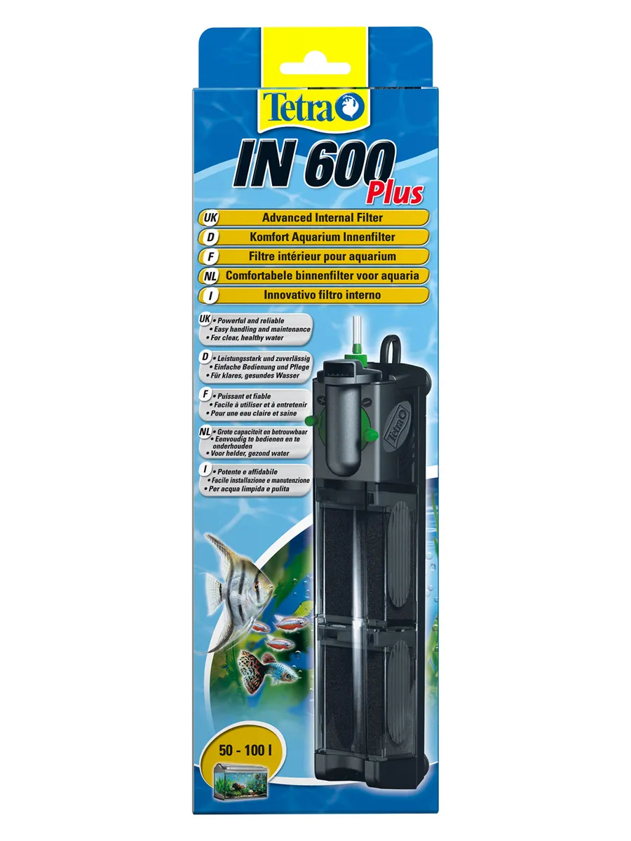Внутренний фильтр TetraTec IN600. Мощный и удобный внутренний фильтр для механической, биологической и химической очистки воды в аквариуме до 100 л. Внутренний рабочий фильтр оборудован 2-мя камерами для очистки воды, за счет этого потери полезных микроорганизмов сведены к минимуму. При очищении самого фильтра прибор не снимается. Для каждого объема аквариума оборот воды настраивается пользователем. Очищенная вода выходит обратно в аквариум через сопла, вращающиеся вокруг оси на 180 градусов. Есть функция дополнительного забора воздуха посредством универсальной системы Venturi. Дизайн фильтра очень лаконичный и компактный, что позволяет размещать прибор в любом месте аквариума. Присоски, размещенные на корпусе фильтра, надежно закрепляют его на поверхности. Качество оборудования подтверждено качественными сертификатами.