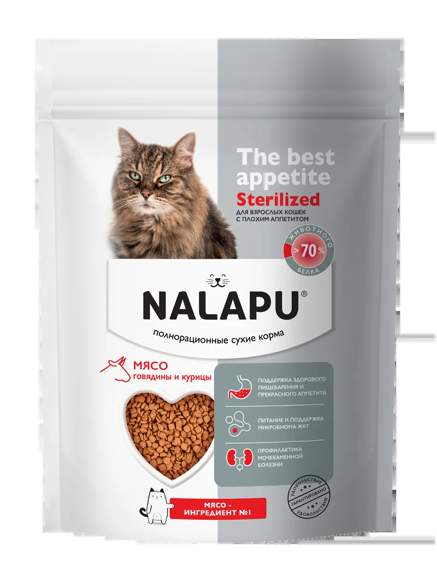 Корм сухой NALAPU The Best appetite Sterilized, с говядиной и курицей, для взрослых кошек с плохим аппетитом: