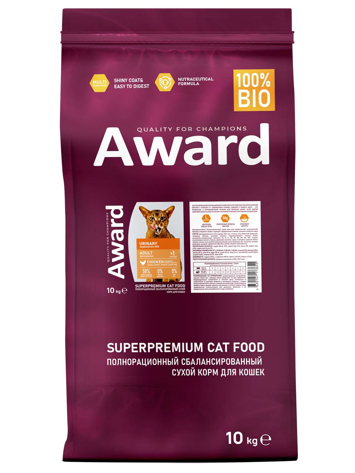 Сухой корм AWARD Urinary для взрослых кошек для профилактики мочекаменной болезни с курицей с добавлением клюквы, цикория и рыбьего жира 10 кг