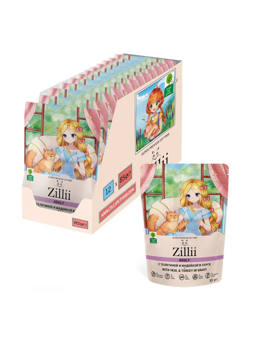 Полнорационный влажный корм для взрослых кошек ZILLII ADULT CAT with Veal and Turkey in gravy изготовлен c использованием телятины и мяса индейки.