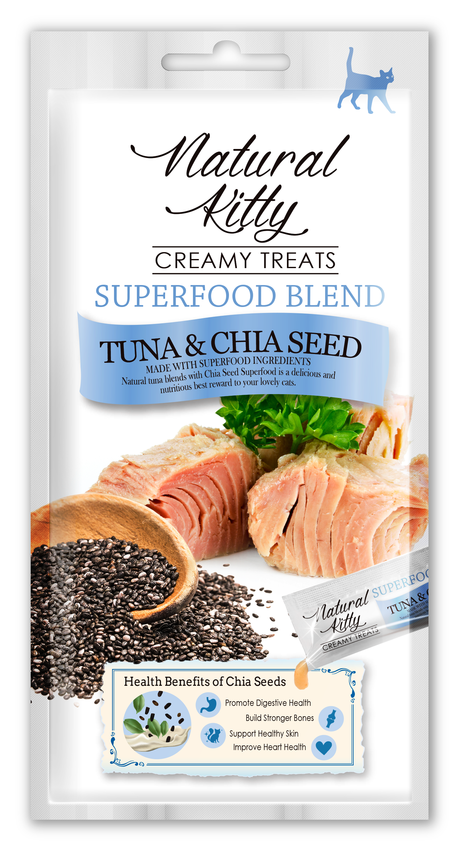 Лакомство для кошек Natural Kitty Creamy treats тунец с семенами чиа 4x12 г – приготовлен из тунца, с добавлением семян чиа, которые содержат различные нутрицевтики, которые помогают увеличивать уровень энергии в организме, контролируют уровень сахара в крови и поддерживают здоровье сердца и сосудов.