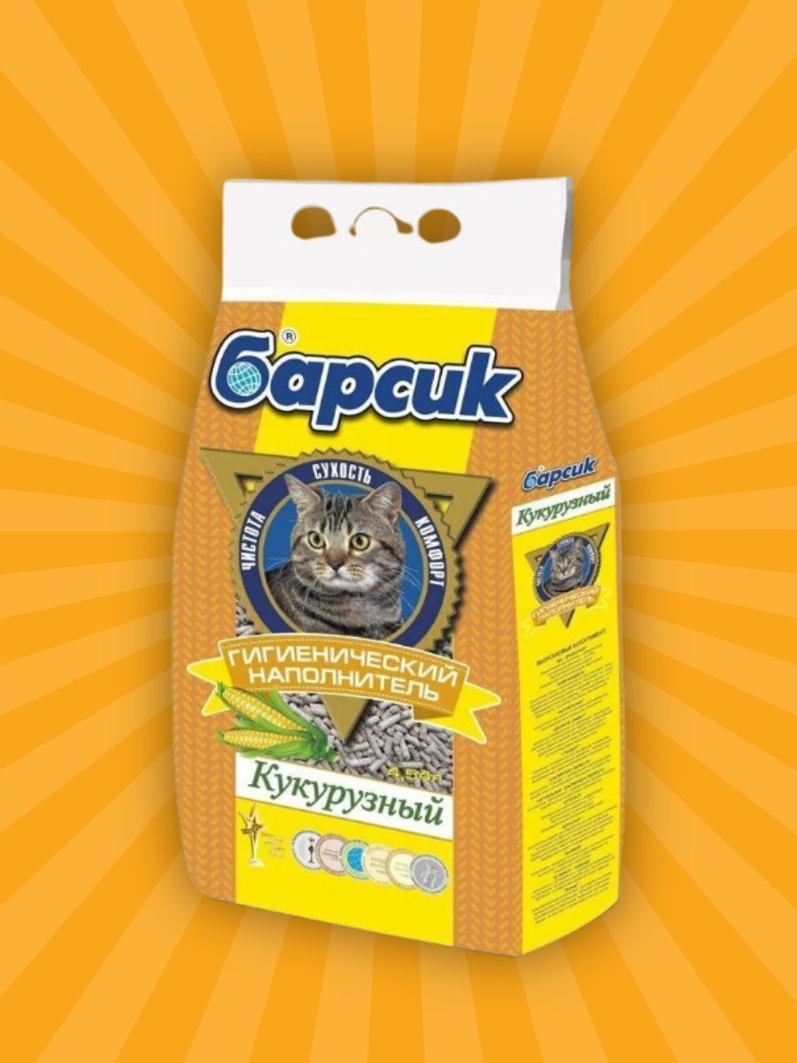 Гигиенический наполнитель БАРСИК КУКУРУЗНЫЙ – экологически чистый высококачественный впитывающий наполнитель для кошачьего туалета, изготовлен из кукурузных початков, обработанных и спрессованных по специальной технологии.