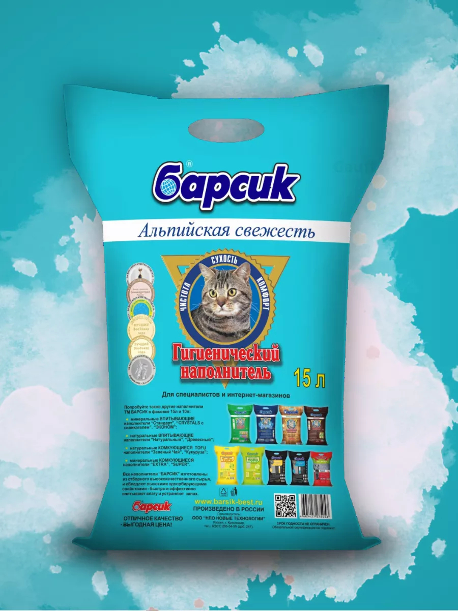 Барсик «Альпийская свежесть» 15л- впитывающий наполнитель для кошачьего туалета, изготовлен из природного минерала – опоковидной глины, прошедшей специальную технологическую обработку, повышающую адсорбирующие свойства минералов в несколько раз, с добавлением ароматизаторов, выработанных из натуральных природных компонентов.