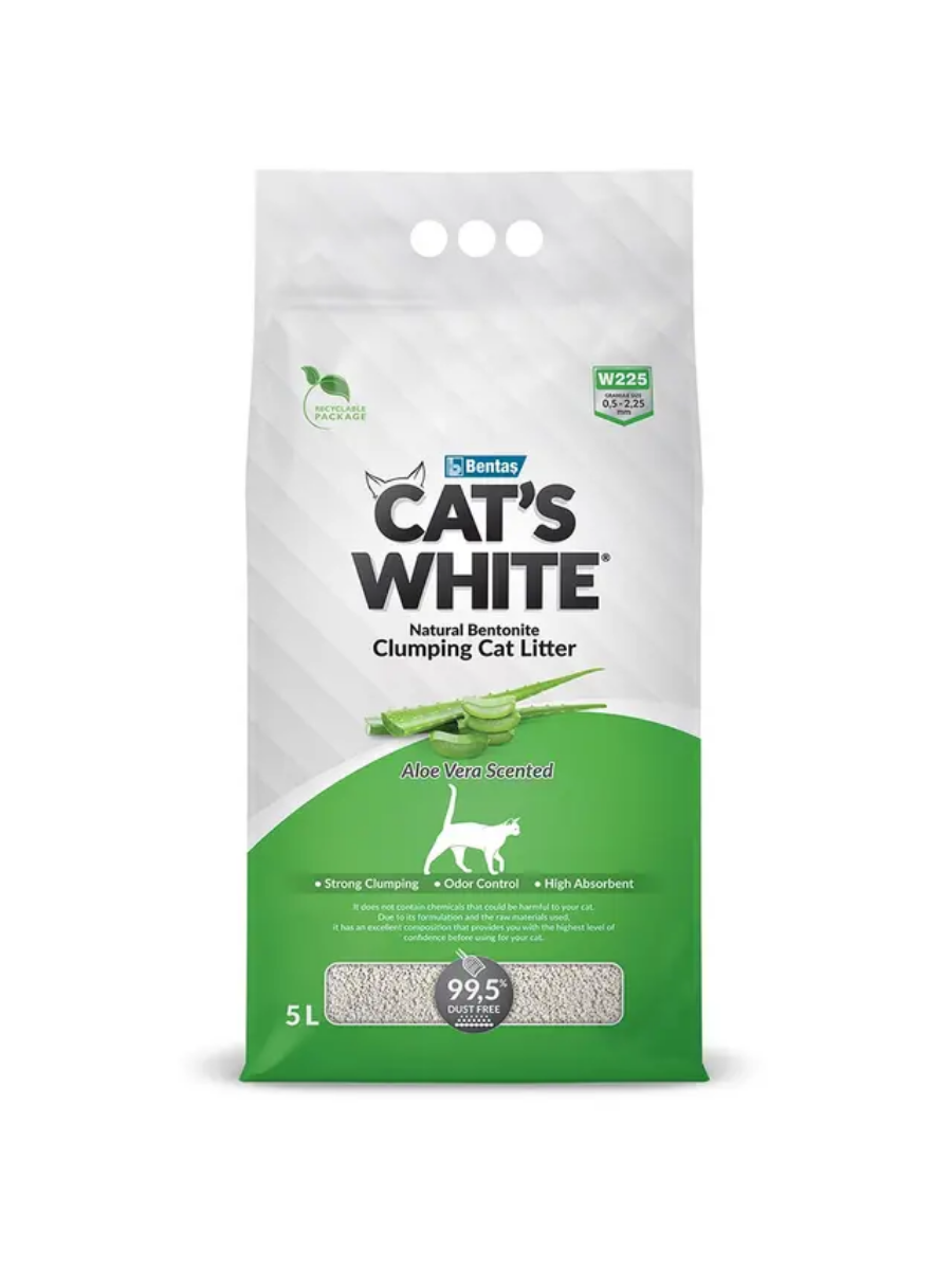 CAT’S WHITE - премиальные комкующиеся наполнители из 100% натуральной бентонитовой глины. Монтмориллонит в структуре глины полностью нейтрализует неприятные запахи.CAT’S WHITE ALOE VERA - это белый наполнитель для кошачьего туалета из 100% НАТУРАЛЬНОЙ БЕНТОНИТОВОЙ ГЛИНЫ с ароматом алоэ вера. Легкие нотки аромата алоэ вера подарят ощущение чистоты и свежести в доме. Наполнители CAT’S WHITE создают гигиеничную среду благодаря превосходному комкованию за 5 секунд.