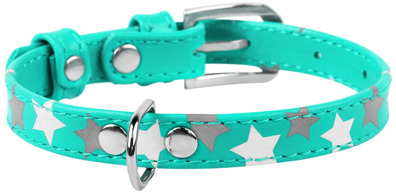 Ошейник для собак WAUDOG Glamour, с QR-паспортом, кожаный, с узором "Звездочка", светящийся (L, 35мм, 46-60см, голубой)