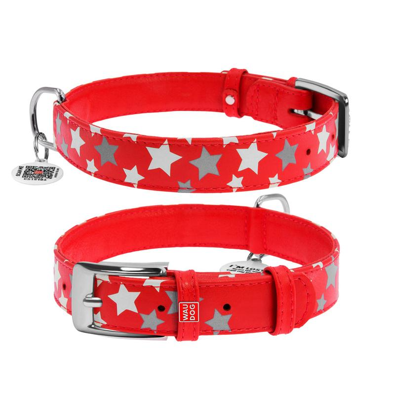 Ошейник для собак WAUDOG Glamour, с QR-паспортом, кожаный, с узором "Звездочка", светящийся (XS, 15мм, 27-36см, красный)