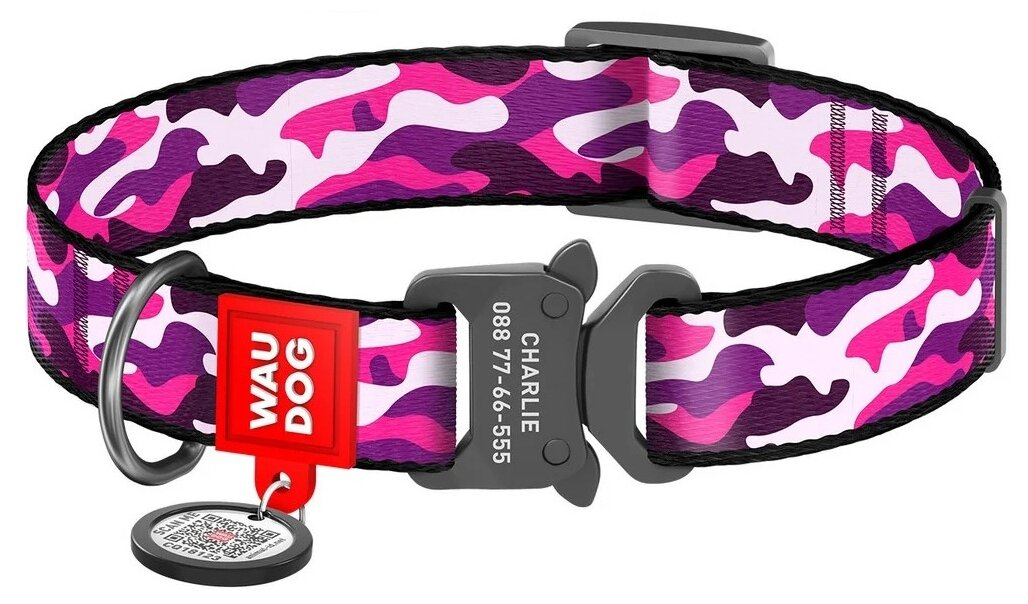 Ошейник для собак WAUDOG Nylon "Розовый камо", с QR-паспортом, нейлоновый, металлический замок (M, ширина 20мм, длина 24-40см)