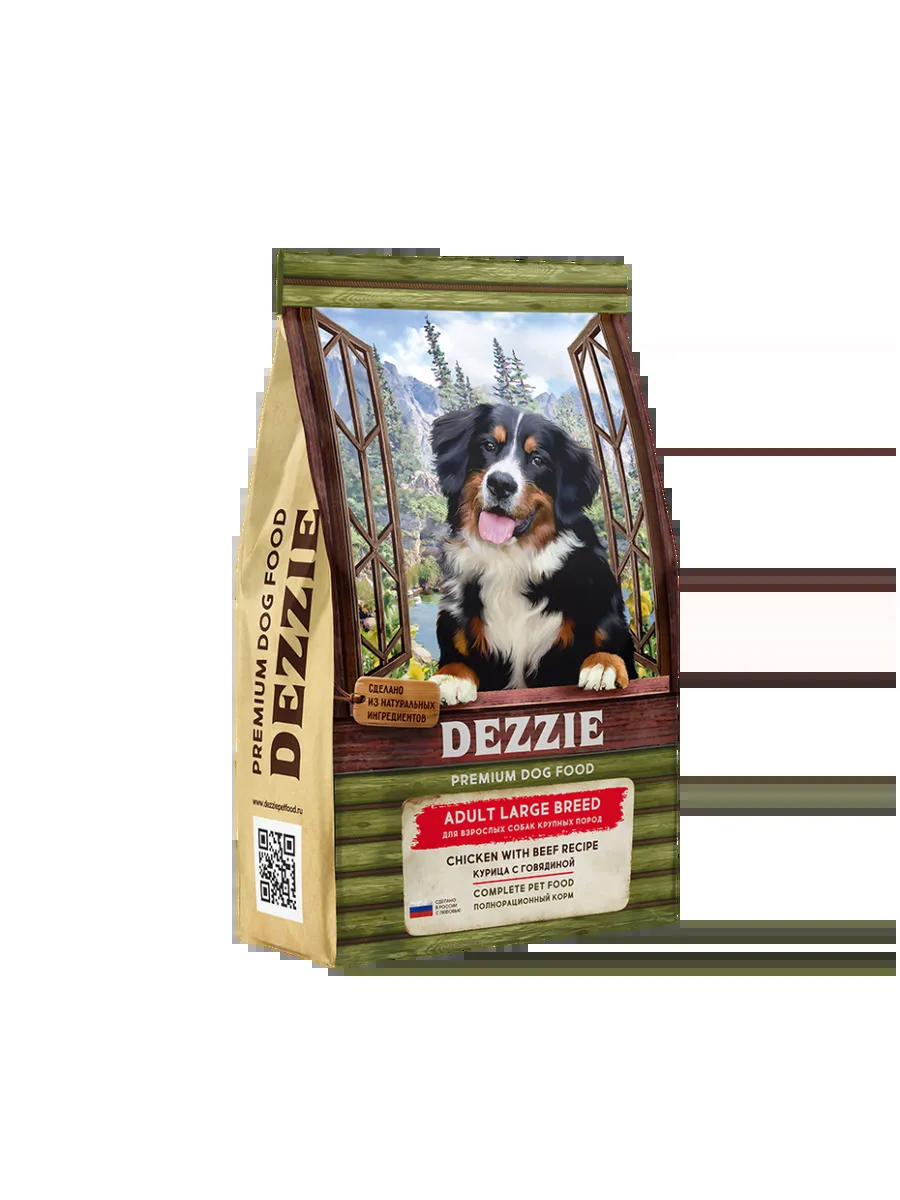 Полнорационный корм для взрослых собак крупных пород DEZZIE ADULT LARGE BREED DOG изготовлен на основе мяса курицы и говядины.