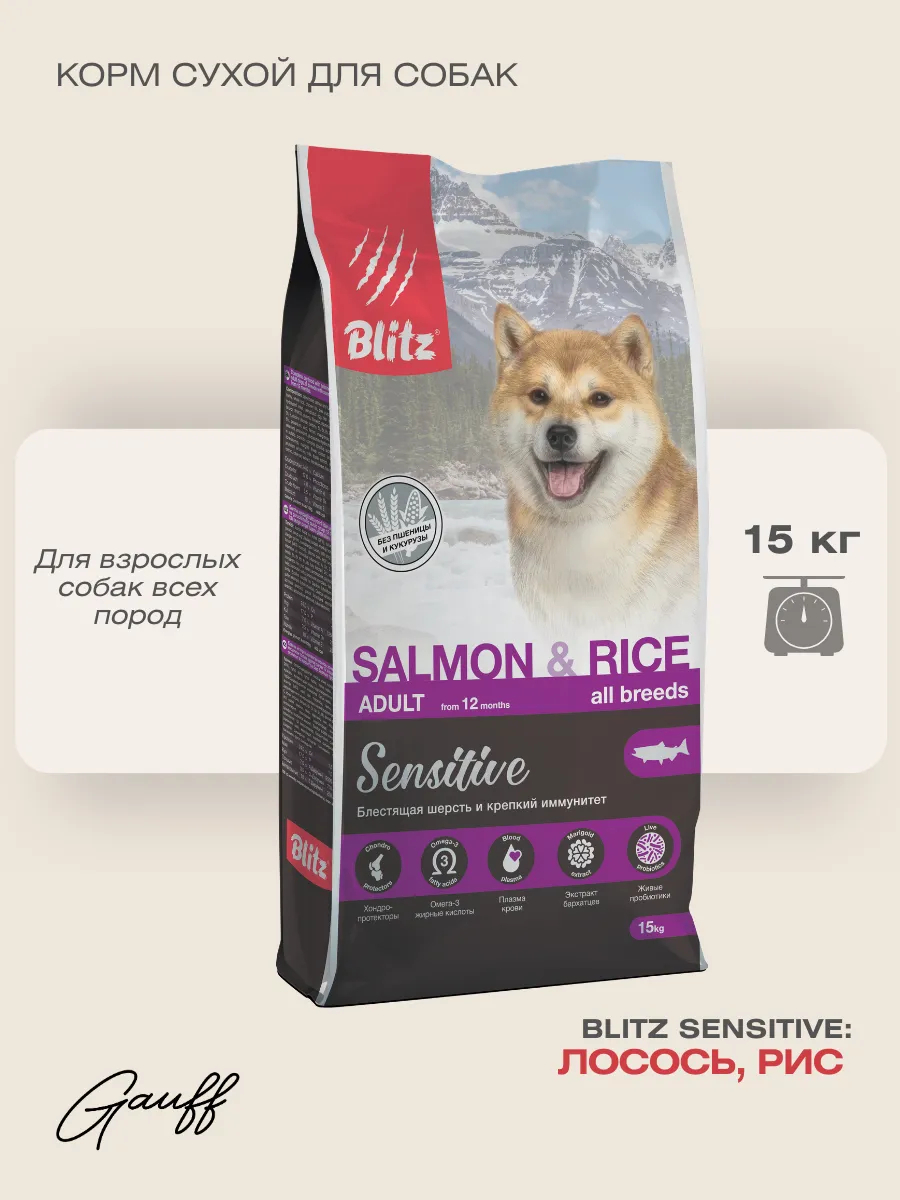 BLITZ Сухой корм для собак всех пород с лососем и рисом, 15 кг
