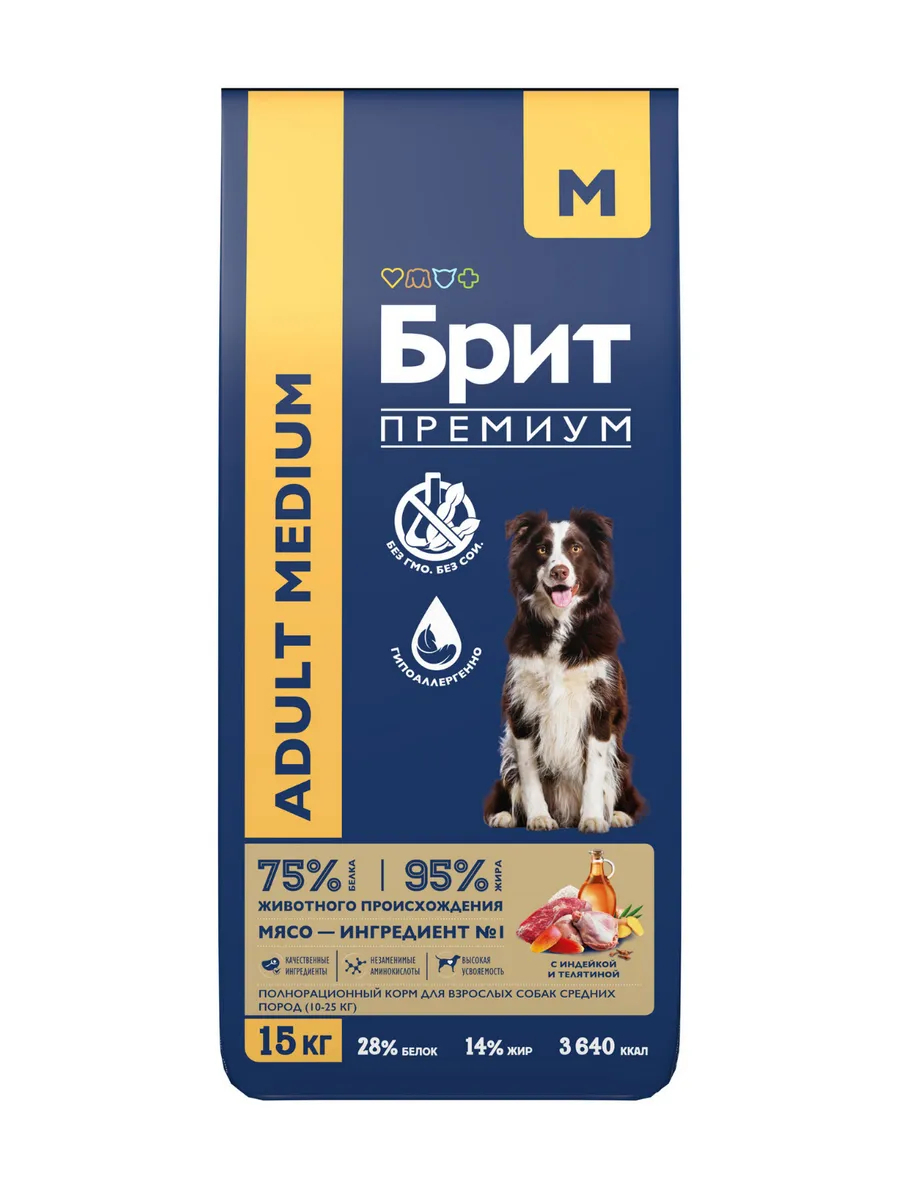 Брит Премиум Dog Adult Medium. Полнорационный сухой корм премиум-класса с индейкой и телятиной для взрослых собак средних пород (10-25 кг), 15 кг