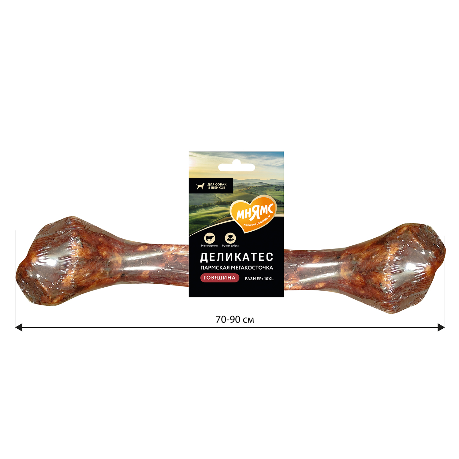 Лакомство Мнямс Деликатес Пармская мегакосточка для собак размер 10XL 1000 г. Пармская МЕГА косточка Мнямс- это вкусное жевательное лакомство для собак и щенков старше 12 недель, изготовленное вручную из сыромятной кожи, запеченной в нежном мясном паштете. Особая технология производства помогает сохранить вкус и максимальную пользу ингредиентов. Лакомство обеспечивает массаж десен, профилактику образования зубного налета, способствует занятию питомца на некоторое время, принося удовольствие от процесса жевания. Из-за ручного способа производства и разной толщины кожи, размер косточки может варьироваться от 70 до 90 см.