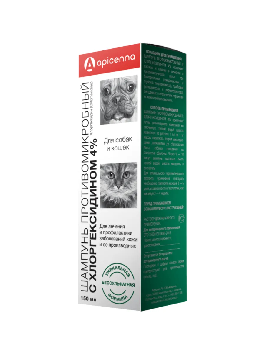 Шампунь противомикробный с хлоргексидином 4% относится к антисептическим лекарственным препаратам.Шампунь противомикробный с хлоргексидином 4% назначают собакам и кошкам с лечебно-профилактической целью при бактериальных (поверхностных и глубоких пиодерматитах), грибковых (малассезиозах и дерматофитозах), смешанных и атопических поражениях кожи и её производных. Противопоказанием к применению Шампуня противомикробного с хлоргексидином 4% является индивидуальная повышенная чувствительность к компонентам лекарственного препарата (в том числе в анамнезе). Не допускается применение препарата собакам и кошкам моложе 3-х недельного возраста. Не допускается применение препарата внутрь и введение в полости.Шампунь противомикробный с хлоргексидином 4% применяют путем равномерного нанесения на смоченную теплой водой шерсть животного из расчета 1 мл на 1 кг массы животного, втирая массирующими движениями до образования пены, избегая попадания на слизистые оболочки. Через 5 – 10 минут шампунь тщательно смыть теплой водой, шерсть высушить и расчесать.Для оптимального терапевтического эффекта применение препарата необходимо повторять каждые 3 – 5 дней, в зависимости от патологии, как минимум 3 – 4 недели.
