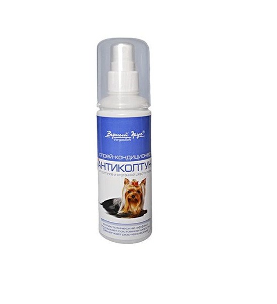 Спрей Антиколтун 100 мл бренда Верный Друг - практичное и удобное в использовании средство для легкого расчесывания шерсти собак. Эффективно избавляет от спутанных волос, обеспечивая шерсть свежим, ухоженным и здоровым видом. Препарат не требует смывания, достаточно распределить его по шерстяному покрову и причесать любимца. Обладает приятным ароматом, не вызывает раздражений.
