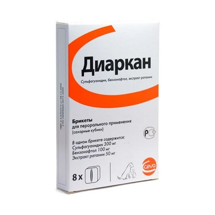 Диаркан относится к комбинированным антибактериальным препаратам.Сульфагуанидин, входящий в состав лекарственного препарата, обладает антибактериальной активностью в отношении кишечной палочки и сальмонелл, как и другие сульфаниламиды, является конкурентным антагонистом парааминобензойной кислоты, препятствует образованию тетрагидрофолиевой кислоты, что в свою очередь нарушает образование пуриновых и пиримидиновых оснований.При пероральном применении сульфагуанидин практически не всасывается, создавая высокие бактериостатические концентрации в кишечнике.Выводится из организма в основном в неизменном виде с фекалиями.Бензонафтол распадается в кишечнике на бензойную кислоту и (3-нафтол, которые оказывают антисептическое действие, выводится с мочой и фекалиями.Экстракт лекарственного растения ратании обладает обволакивающим действием и препятствует всасыванию токсинов в кровь.Диаркан применяют собакам и кошкам для лечения энтеритов бактериальной этиологии, вызванных микроорганизмами, чувствительными к сульфагуанидину и бензонафтолу. Диаркан противопоказан к применению при выраженных нарушениях функции почек и печени, мочекаменной болезни, беременности, повышенной чувствительности к сульфаниламидным препаратам, а также щенкам и котятам в подсосный период и массой менее 1 кг.Диаркан назначают животным 2 раза в сутки с интервалом 12 часов, в тяжелых случаях заболевания - 3 раза в сутки с интервалом 8 часов в течение 3-5 дней в следующих дозах:кошкам и карликовым собакам (1-5 кг) - 1/2 кубикамаленьким собакам (5-15 кг) - 1 кубиксредним собакам (15-30 кг) - 11/2 кубикабольшим собакам (30 кг и больше) - 2 кубикаСахарный кубик добавляют в корм животному или питьевую воду, собакам скармливают с руки хозяина. Для предупреждения кристаллурии в период применения лекарственного препарата рекомендуется обильное поение, для этого животному следует обеспечить свободный доступ к воде.