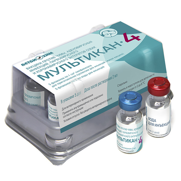 Мультикан-4 — это отечественная комплексная вакцина для профилактики четырех опасных вирусных заболеваний у собак: чумы плотоядных, аденовирусных инфекций, парвовирусного и коронавирусного энтеритов.