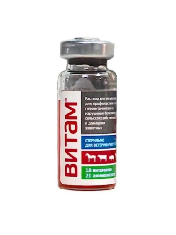 Витаминно-аминокислотный комплекс «Витам», благодаря наличию сбалансированного количества витаминов, аминокислот, микроэлементов и глюкозы, компенсирует дефицит этих биологически активных веществ в организме животных, возникающий при стрессах, профилактических прививках и дегельминтизации, после перенесенных заболеваний, способствует нормализации обмена веществ у животных. Глюкоза является источником энергии, улучшает дезинтоксикационную функцию печени, усиливает сократительную деятельность сердечной мышцы. Применение препарата стимулирует процессы кроветворения, окислительно-восстановительные реакции, нормализует обмен веществ, повышает неспецифическую резистентность организма.